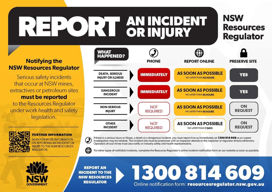 There are six (6) types of incidents that must be reported to the Resource Regulator. These are:
